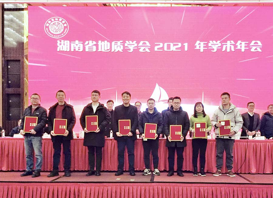 黄树春等22名同志获得2021年湖南省青年地质科技奖,文春华等15名同志获得优秀论文奖,其中一等奖5篇、二等奖10篇。与会领导向获奖的同志颁发获奖证书和奖金,并鼓励他们继续发扬严谨、钻研、探索的科学精神,取得更大的科研成就。
