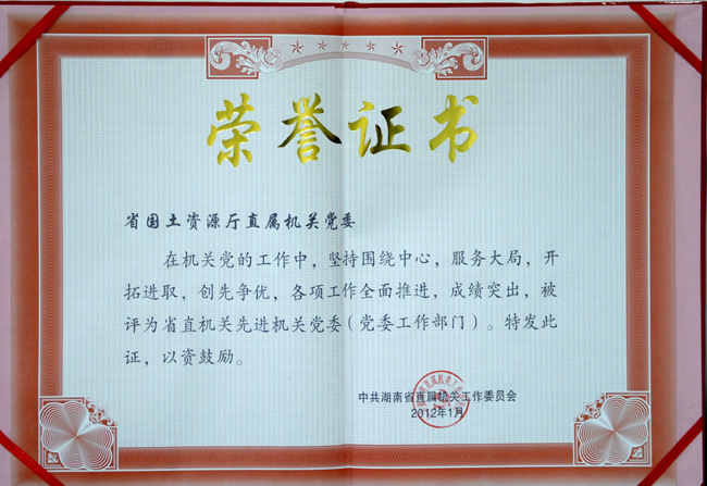 2012年1月9日,在湖南省直机关党的工作会议上,省国土资源厅直属机关党委被表彰为2011年度“先进机关党委”、“双联帮扶”先进单位、学习型党组织建设先进集体。2011年,我厅先后被省委组织部、省总评为“党建带工建、和谐促发展”先进单位,被省委创先争优领导小组确定为创先争优活动示范创建点;获省直创先争优理论研讨文章优秀成果奖、机关党建新闻工作先进单位;省直“十佳全民健身先进单位”、省直第三届职工运动会团体奖、省直工会一等奖;省直优秀团组织等10多个表彰和奖励。