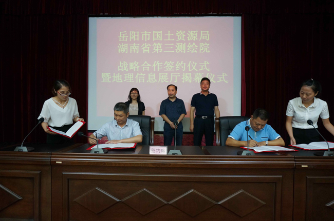 8月26日,省第三测绘院与岳阳市局签订《测绘地理信息战略合作框架协议》,成为湖南国土资源系统第一个与市国土资源局签订战略合作协议的技术支撑单位。同日,岳阳地理信息展厅同时向公众开放。厅党组成员、副厅长金勇章与岳阳市人大副主任彭先政见证签约并为地理信息展厅揭幕。