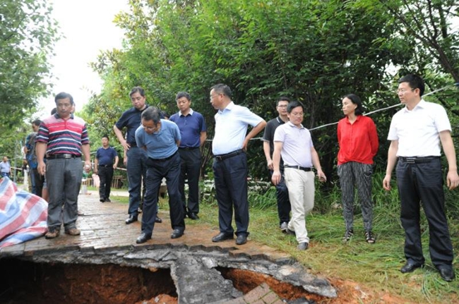 方先知在宁乡祖塔村王家湾组勘查灾害现场,要求科学防灾救灾治灾