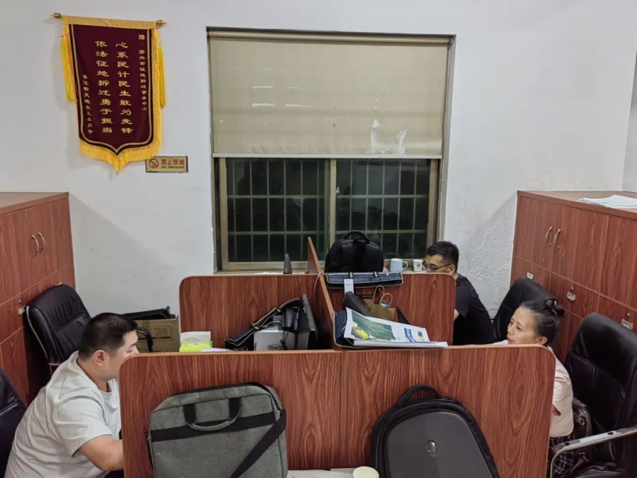 8月18日晚上十点,资兴市自然资源局一楼,村民安置规划选址组内业、外业工作人员聚在一起,就安置选址地块进行讨论。