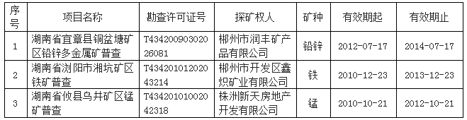 湖南省宜章县铜盆塘矿区铅锌多金属矿普查、湖南省浏阳市湘坑矿区铁矿普查和湖南省攸县乌井矿区锰矿普查三宗探矿权,在勘查许可证有效期届满前未依法办理延续登记申请手续,根据《行政许可法》第七十条和《矿产资源勘查区块登记管理办法》(国务院令第240号)第十条的有关规定,对这三宗探矿权勘查许可证予以注销。注销的三宗探矿权勘查许可证基本信息如下: