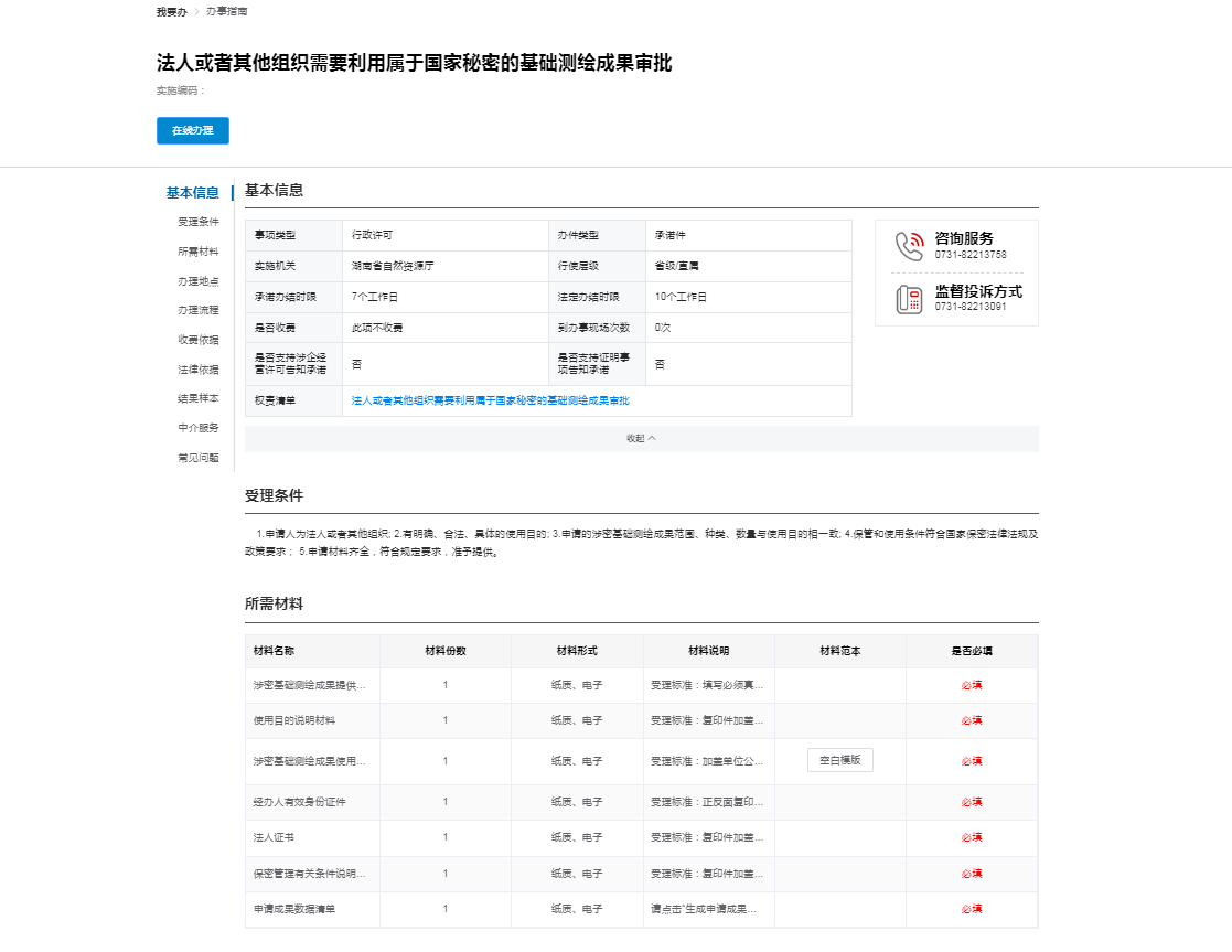 更多办事指南详情请进入湖南省自然资源厅智慧平台网上办事大厅( https://zw.zrzyt.hunan.gov.cn:8085/),点击“网上办理”—“测绘地信”—“法人或者其他组织需要利用属于国家秘密的基础测绘成果审批”—“办事指南”进行查看。