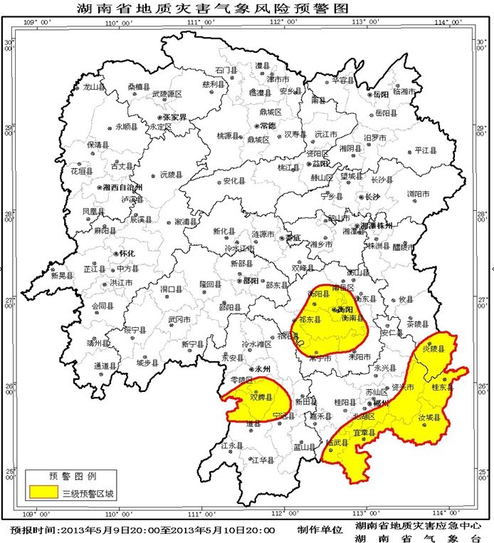 根据省气象台2013年5月9日短期气象预报情况,湖南省地质灾害应急中心与省气象台联合会商得出如下结论:自5月9日20:00至10日20:00,受降雨影响我省湘中以南部分区域发生突发性地质灾害风险较高(黄色预警),预警区域包括:永州市双牌县,宁远县西部,道县北部,零陵区东南部,衡阳市衡南县,衡阳县东部,常宁市北部,耒阳市北部,祁东县南部,衡东县西部,株洲市炎陵县,郴州市汝城县,桂东县,宜章县,资兴市,临武县东部,苏仙区南部,北湖区南部等,具体预报区域见附图。请上述地区注意防范地质灾害,做好险情和灾情速报工作。以上情况供政府决策时参考。