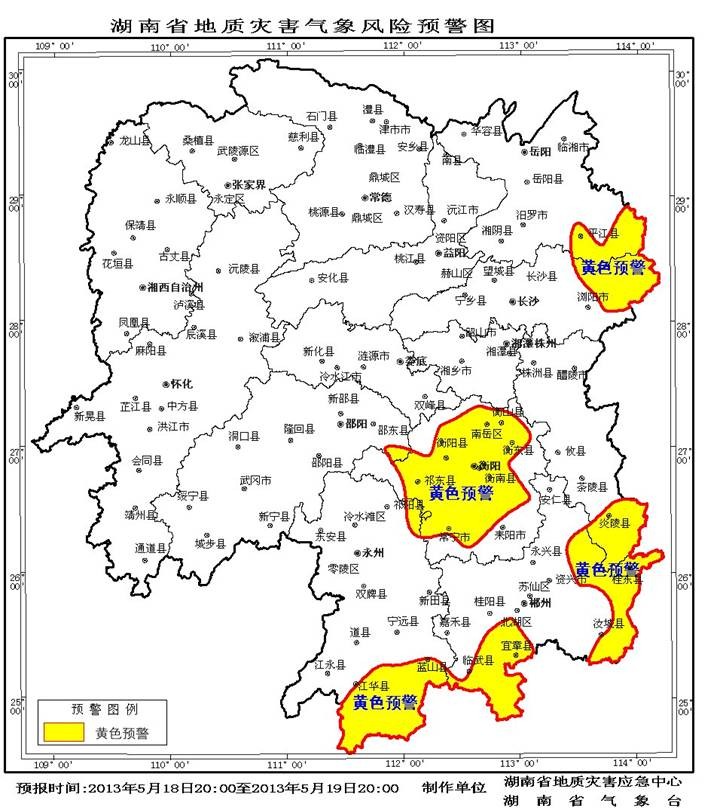 根据省气象台2013年5月18日短期气象预报情况,湖南省地质灾害应急中心与省气象台联合会商得出如下结论:自5月18日20:00至19日20:00,受降雨影响我省湘东和湘南部分区域发生突发性地质灾害风险较高(黄色预警),预警区域包括:长沙市浏阳市北部,岳阳市平江县南部,衡阳市南岳区、衡山县、衡阳县南部、衡东县西部、衡南县、耒阳市北部、常宁市北部、祁东县东部,邵阳市邵东县南部,永州市祁阳县东部、蓝山县南部、江华县、道县南部、宁远县南部,株洲市炎陵县,郴州市北湖区南部、桂东县、汝城县东部、资兴市东北部、永兴县东部、宜章县、临武县东南部等,具体预报区域见附图。请上述地区注意防范地质灾害,做好险情和灾情速报工作。以上情况供政府决策时参考。