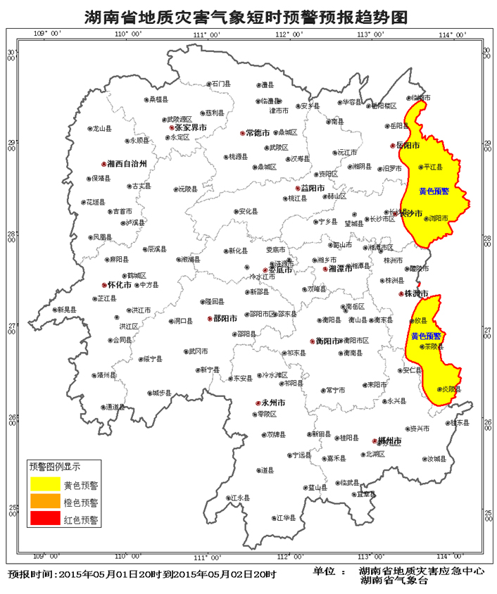 根据湖南省气象台2015年5月1日短期气象预报情况,湖南省地质灾害应急中心与湖南省气象台联合会商得出如下结论: 5月1日20:00至2日20:00,受降雨影响,湘东部分区域发生突发性地质灾害风险较高(黄色预警)。
