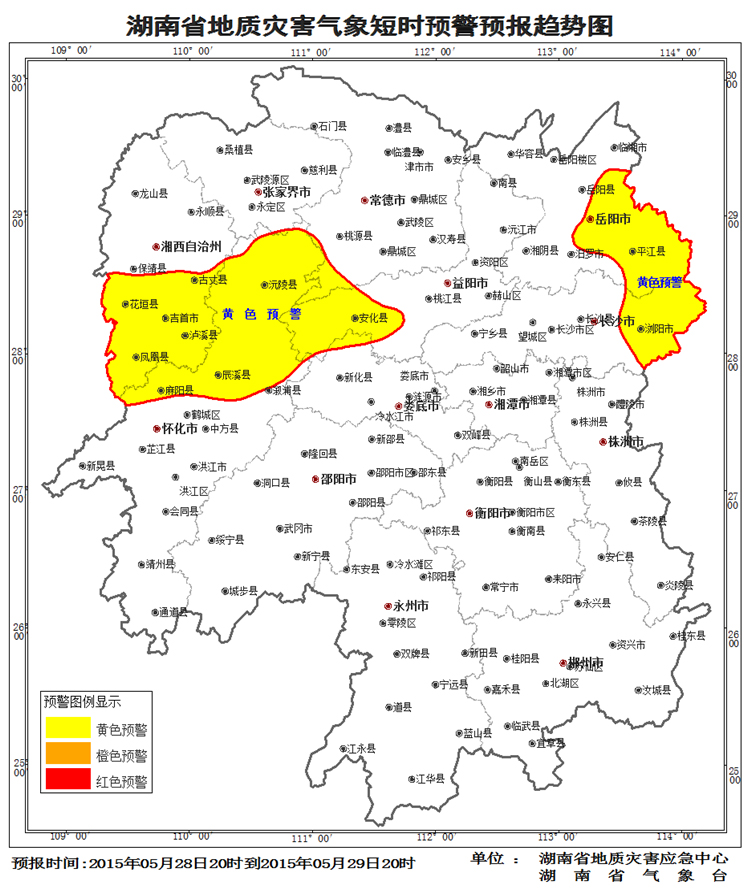 根据湖南省气象台2015年5月28日短期气象预报情况,省地质灾害应急中心与省气象台联合会商得出如下结论: 5月28日20:00至29日20:00,受降雨影响,湘西、湘东北部分区域发生突发性地质灾害风险较高(黄色预警)。