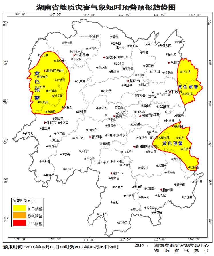 根据省气象台2016年5月1日短期气象预报情况,省地质灾害应急中心与省气象台联合会商得出如下结论:自5月1日20:00至2日20:00,受降雨影响,湘东、湘西部分区域发生突发性地质灾害风险较高(黄色预警),