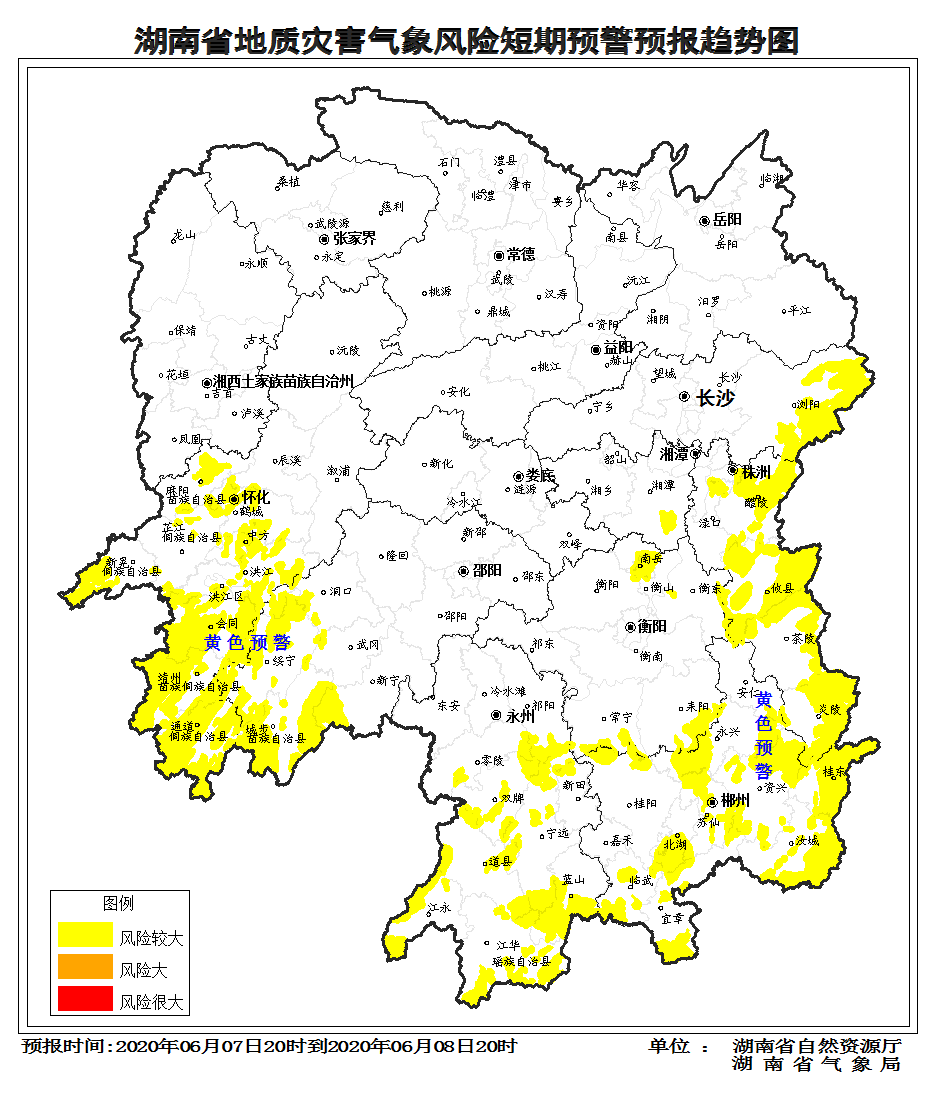 根据湖南省气象局2020年6月7日短期气象预报情况,省自然资源厅与省气象局联合会商得出如下结论:自6月7日20:00至8日20:00,受降雨影响,湘东、湘西南、湘南大部分区域发生突发性地质灾害风险较大(黄色预警)。