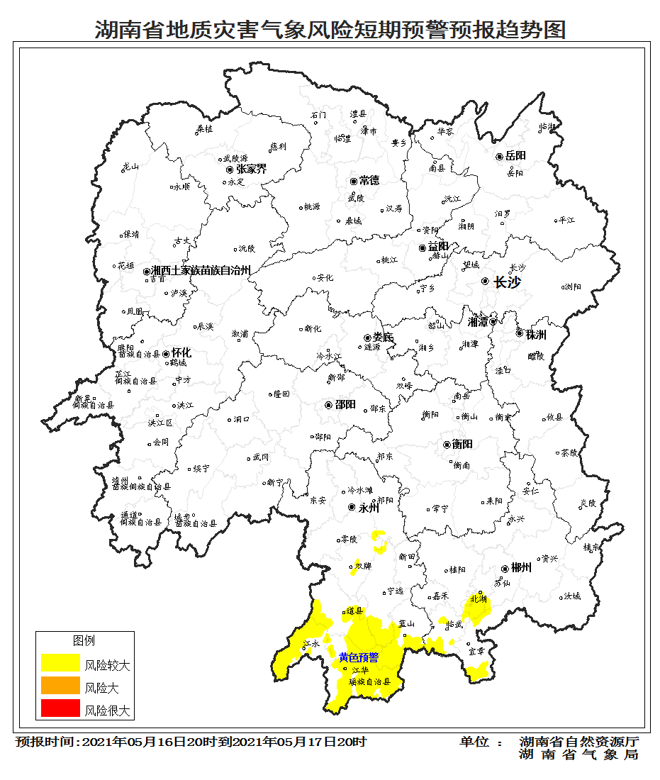 根据地质灾害成灾规律和孕灾条件,结合2021年5月16日短期气象预报情况,省自然资源厅与省气象局联合会商得出如下结论:自5月16日20:00至17日20:00,受降雨影响,湘南局部区域发生突发性地质灾害风险较大(黄色预警)。