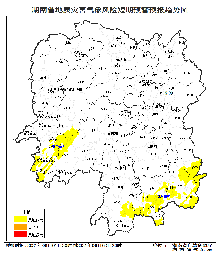 根据地质灾害成灾规律和孕灾条件,结合2021年6月1日短期气象预报情况,省自然资源厅与省气象局联合会商得出如下结论:自6月1日20:00至2日20:00,受降雨影响,湘西南、湘南部分区域发生突发性地质灾害风险较大(黄色预警)。