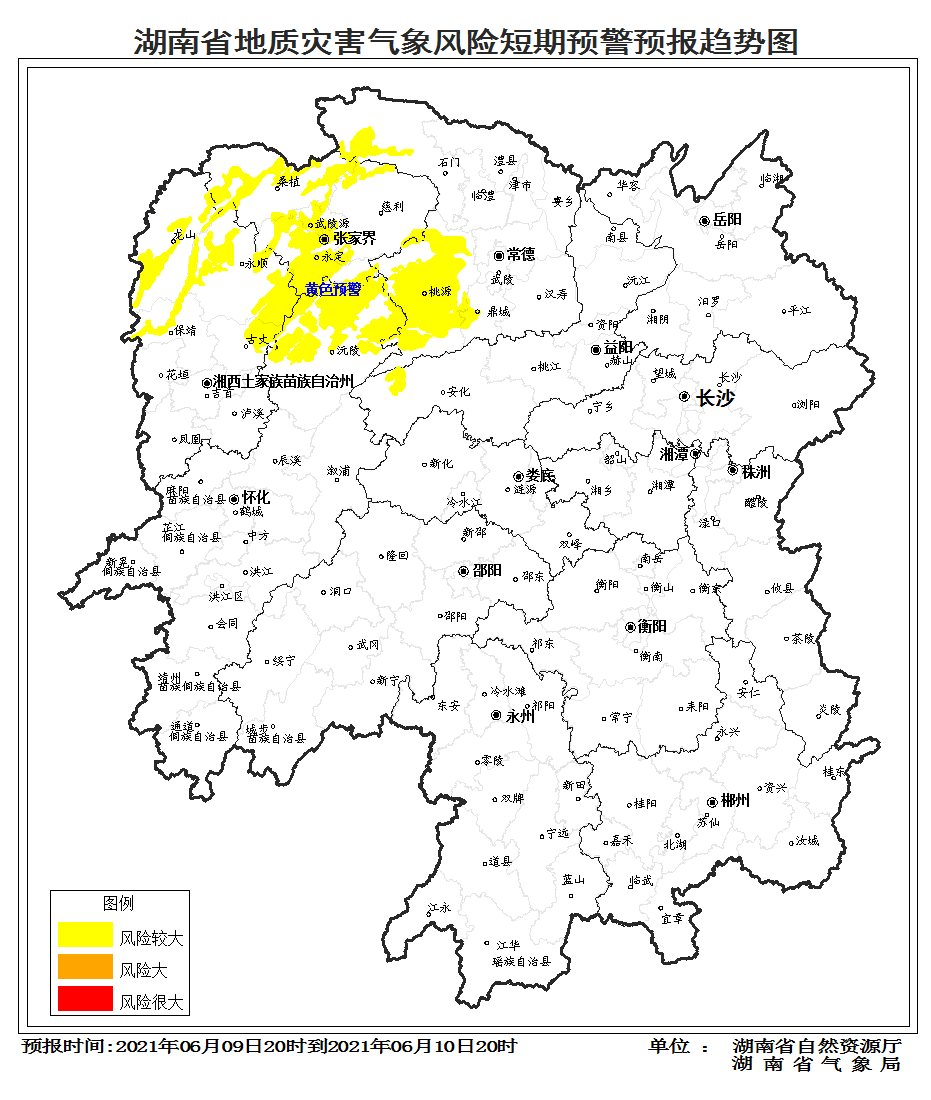 根据地质灾害成灾规律和孕灾条件,结合2021年6月9日短期气象预报情况,省自然资源厅与省气象局联合会商得出如下结论:自6月9日20:00至10日20:00,受降雨影响,湘北、湘西北部分区域发生突发性地质灾害风险较大(黄色预警)。