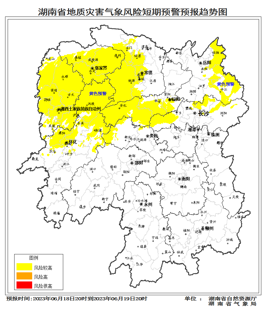根据地质灾害成灾规律和孕灾条件,结合2023年6月18日短期气象预报情况,省自然资源厅与省气象局联合会商得出如下结论:自6月18日20:00至19日20:00,受降雨影响,湘北、湘中大部分区域发生突发性地质灾害风险较高(黄色预警)。