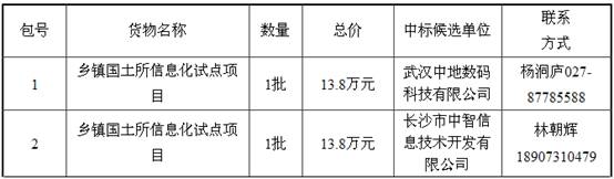 湖南省省直机关政府采购中心受湖南省国土资源信息中心的委托,对其所需乡镇国土所信息化试点项目进行单一来源,现将开标结果公告如下:
