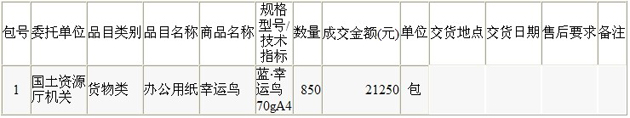 国土资源厅机关对关于办公用纸的协议采购采购项目依法进行协议采购,结果如下: