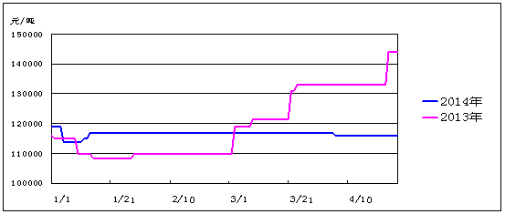 2014年上半年湖南省精钨矿价格以低位企稳为主,以65%黑钨精矿为例,年初价格为119000元/吨,一月上旬价格有所下降,一月下旬开始回升企稳,价格一直在117000元/吨(图8)。上半年平均价格为116669.5元/吨,较去年同期平均价119487.3元/吨减少了2.36%。