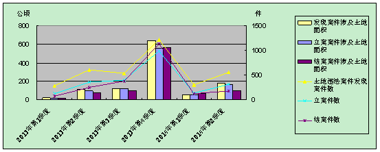 土地违法案件同比减少,矿产违法案件同比增加。上半年全省共发现土地违法案件852件,涉及土地面积235.37公顷,其中耕地56.82公顷,同比去年上半年分别减少4.59%、75.96%和增长29.58%;全省土地违法立案450件,涉及土地面积216.52公顷,其中耕地53.53公顷,同比去年同期分别减少5.66%、101.25%和增长43.36%;全省土地违法结案305件,涉及土地面积165.38公顷,其中耕地42.72公顷,同比去年同期分别减少6.44%、增长90.31%和增长66.42%;罚没款 1188.64 万元,收回土地面积 1.14 公顷,同比去年同期分别增长3.31%和减少82.1%(图5)。