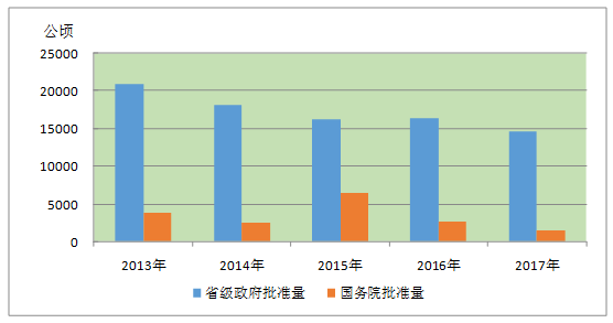 2017年全省批准建设用地总面积16107.75公顷,同比减少15.55%。其中,获国务院批准用地1470.95公顷,同比减少44.48%;省级人民政府批准14636.80公顷,同比减少10.88%。省级批准量中含农用地12456.96公顷,耕地6615.56公顷。