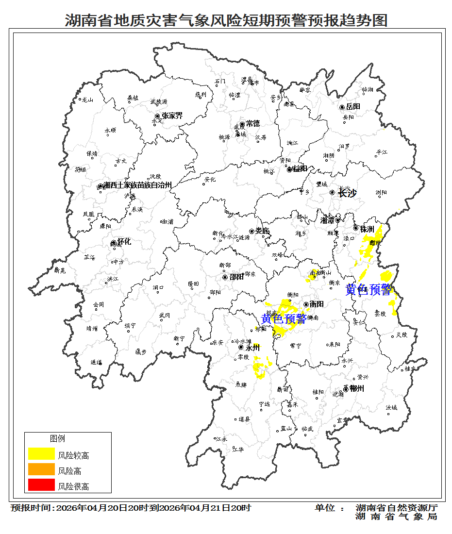 根据地质灾害成灾规律和孕灾条件,结合2026年4月20日 短期气象预报情况,省自然资源厅与省气象局联合会商得出如下结论:自4月20日20:00至21日20:00,受降雨影响,湘中的株洲、衡阳、永州等市州山地丘陵区发生突发性地质灾害风险较高黄色预警。